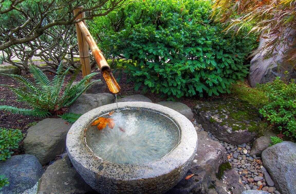 Еще одним типично японским элементом дизайна является цукубаи. Это небольшая чаша из камня округлой формы, к которой по бамбуковой трубке поступает вода и стекает под чашу в дренаж. Цукубаи предназначена для чайной церемонии. В ней не моют руки, воду из нее зачерпывают специальным бамбуковым ковшиком. В европейских садах, стилизованных под Японию, цукубаи выполняют декоративную функцию.