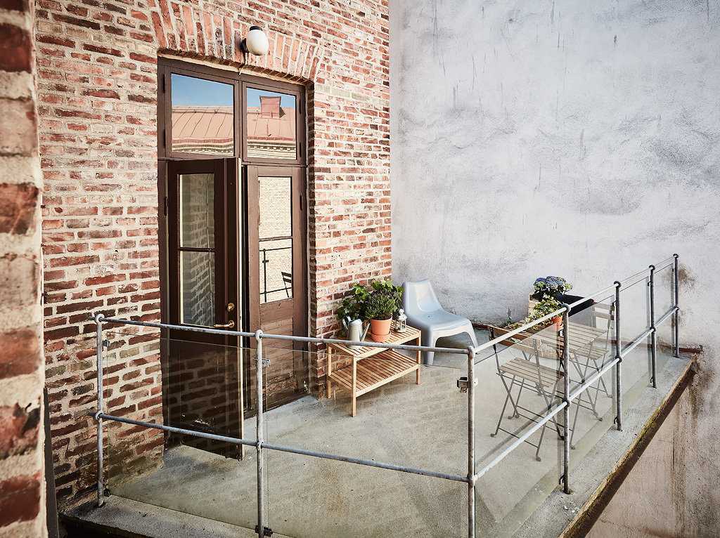 Стиль лофт характеризуется минимализмом и первозданными материалами. На фотографии выше показан балкон с кирпичными и оштукатуренными стенами. В интерьере также использовались стекло, металл и пластик. Стиль лофт не терпит излишних украшений, все необработанное и фактурное.