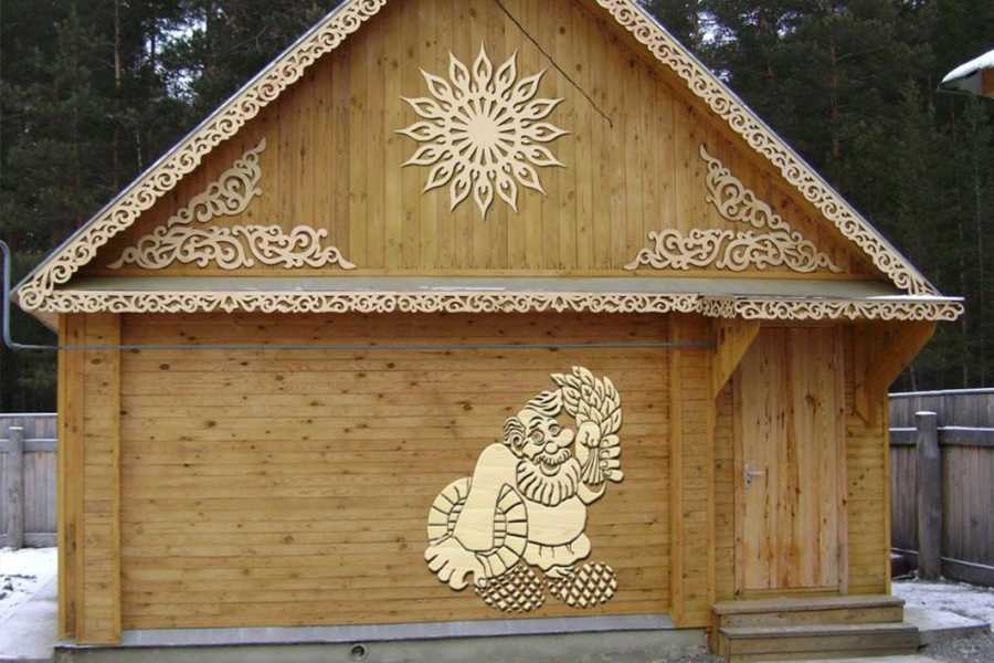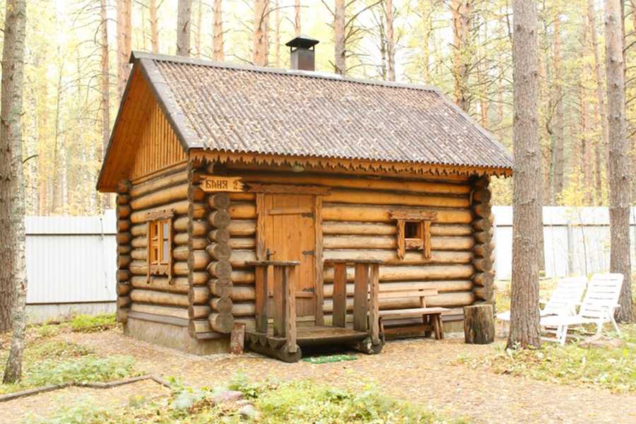 Декоративным решением могут стать резные элементы или роспись наружных стен бани в русском стиле. Экстерьер можно оставить без украшения вообще. Бревенчатая баня будет смотреться аутентично даже без специального оформления.