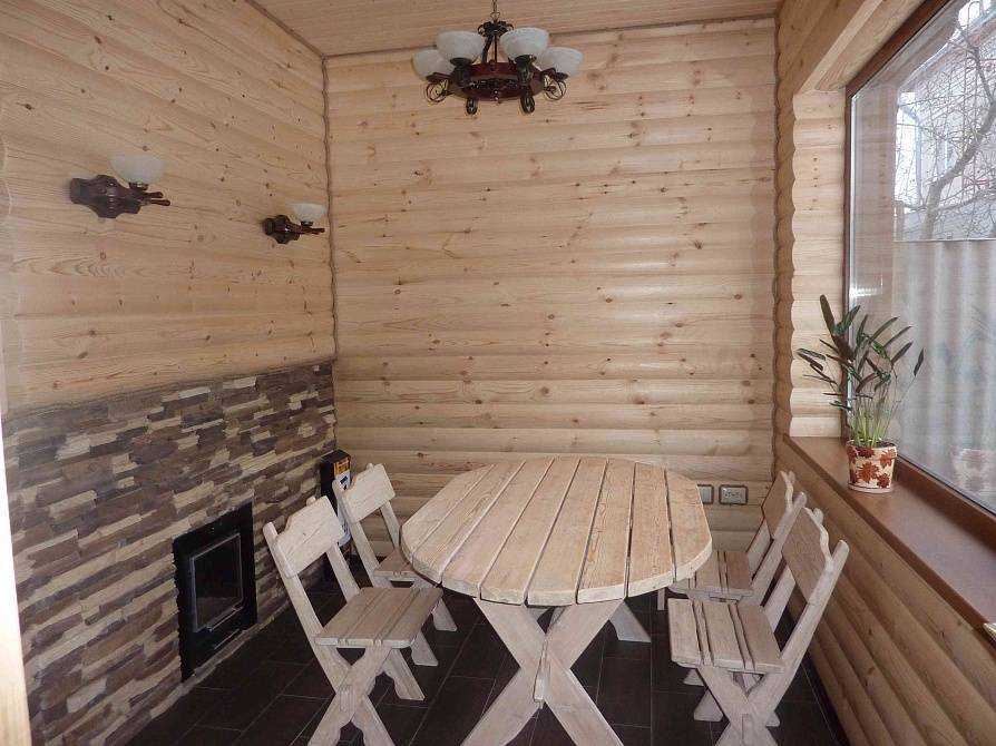 - Декор стен из бруса или бревна, потолочные перекрытия – из балок, пол – доски и керамическая плитка.