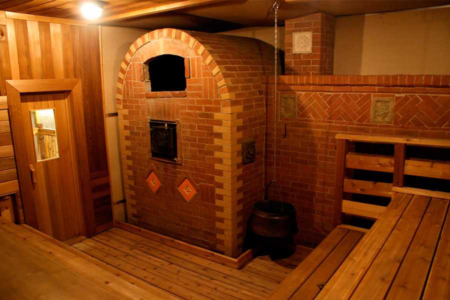 Установка каменки также требует дизайнерского подхода — во-первых, следует защитить от чрезмерного нагревания деревянные стены. Для этого пространство возле печи делают из камня или плитки