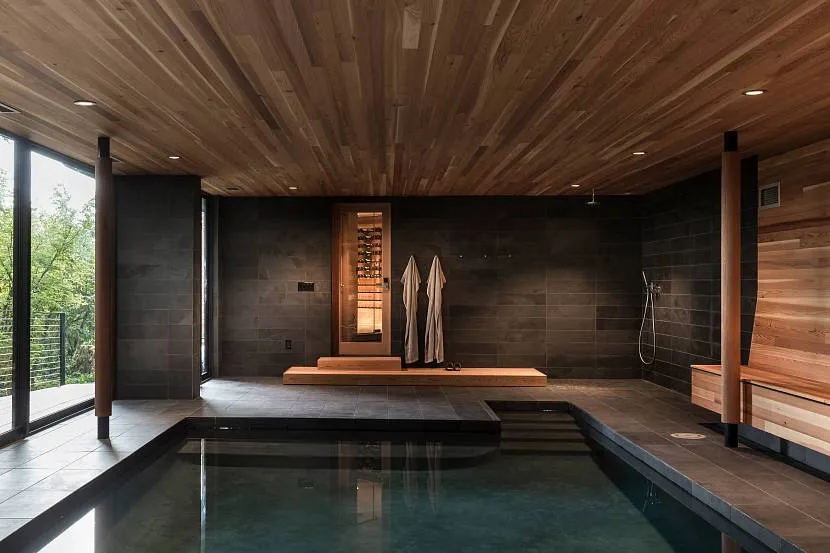 Современный интерьер с бассейном. Отделка из натуральной древесины и керамогранита