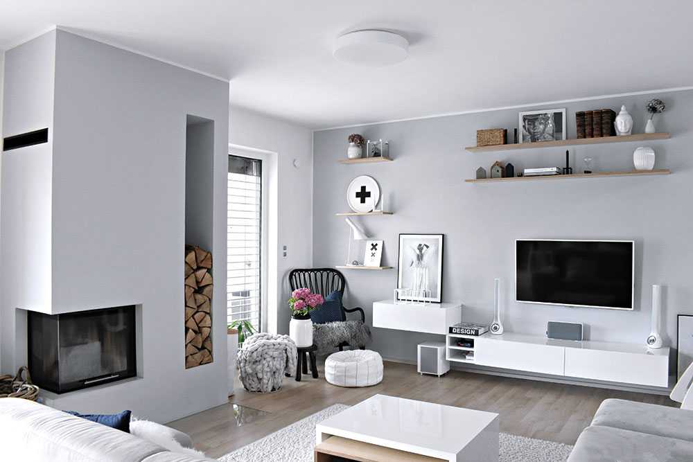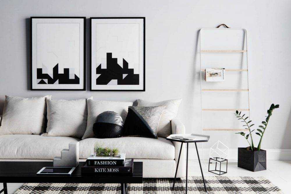 - Простому, бесхитростному скандинавскому интерьеру в качестве реализации отлично подойдет черно-белый дизайн гостиной – белые стены и потолок наполнят комнату светом и воздухом;