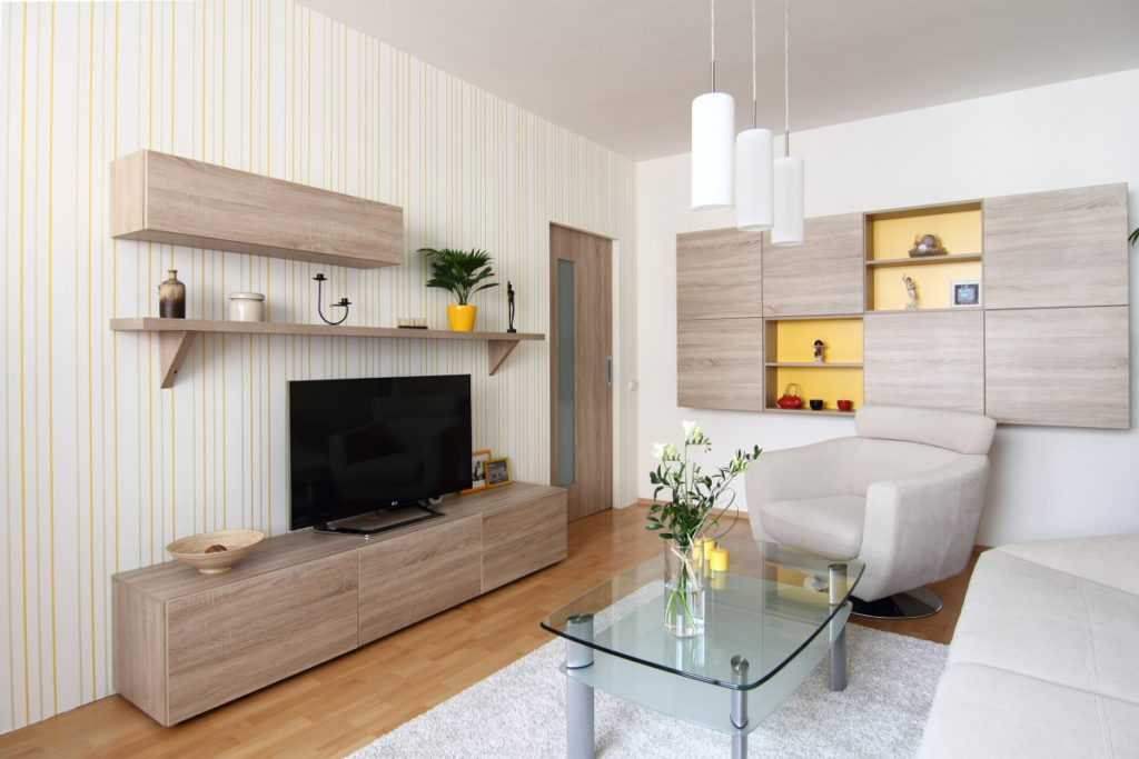 Прекрасным вариантом для облицовки стен в зале, являются обои или декоративная штукатурка. Намного лучше смотрится стеновая поверхность, выполненная в нескольких бежевых оттенках или оформленная отдельными вставками, в виде каменной кладки или натуральной древесины.