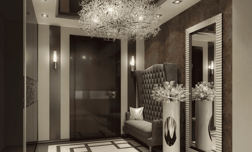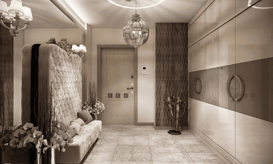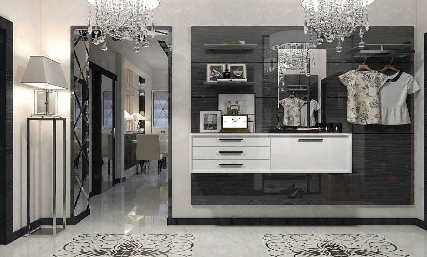 Интерьер прихожей в квартире-студии не терпит экономии на материалах, поскольку необходима детальная проработка сразу всех составляющих – напольного покрытия, стен, потолка, освещения и мебели.