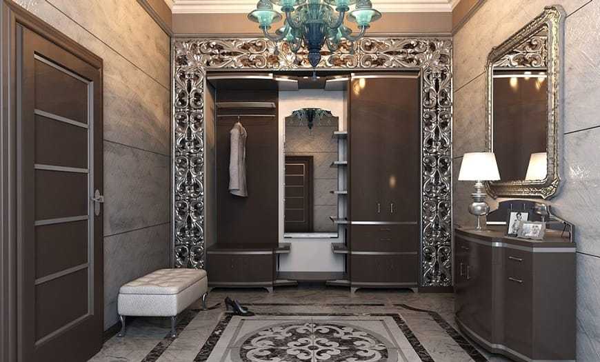 Прекрасно, если места достаточно для размещения шкафа-купе с зеркальными панелями. Это решение зрительно увеличит пространство. В небольших прихожих выигрышнее смотрятся простые зеркала — без тонировки и узоров.