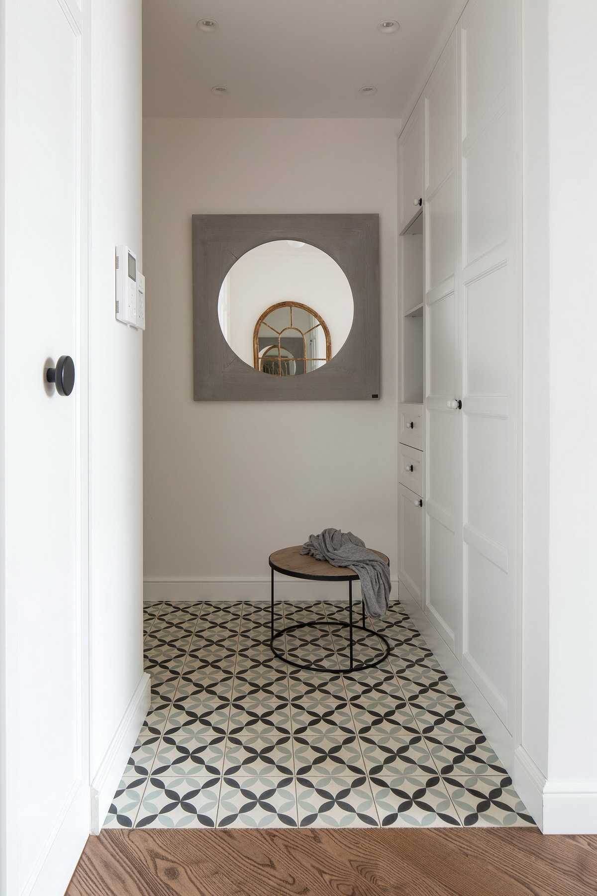 Визуальные границы прихожей в студии создаются при помощи мебели, напольного покрытия и потолочных панелей. Полы будут отличаться и по цвету, и по фактуре – с этой задачей хорошо справляется как плитка или ламинат, так и ковер.