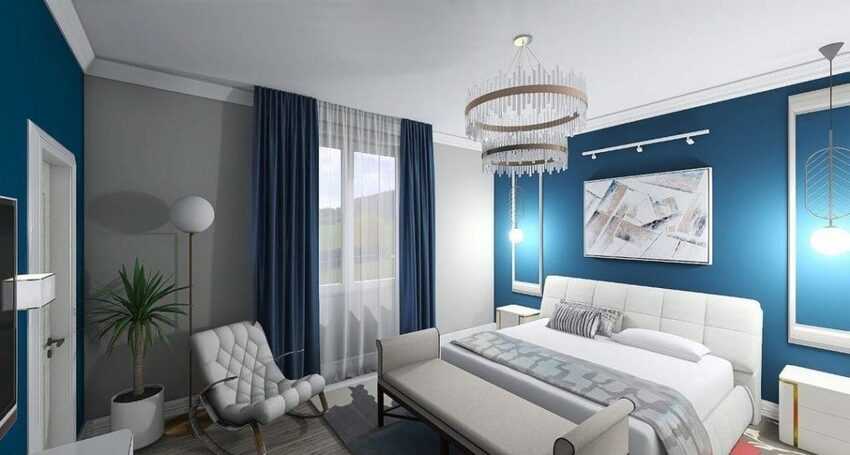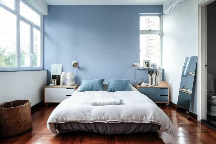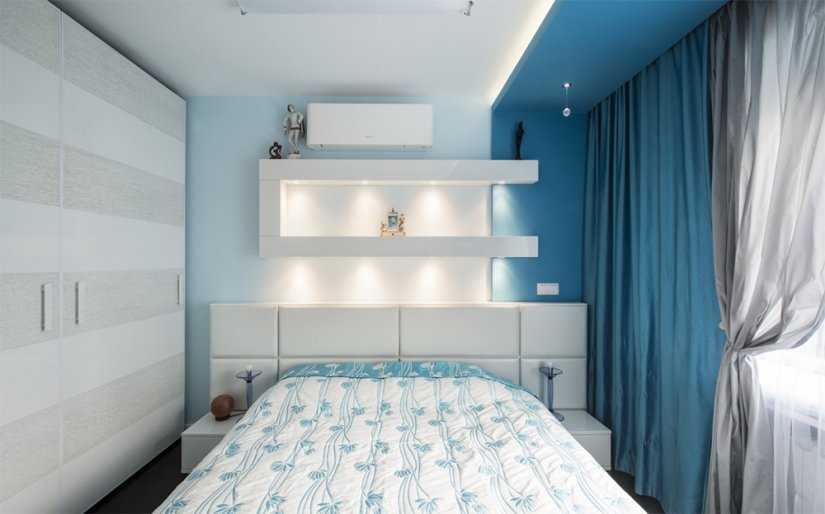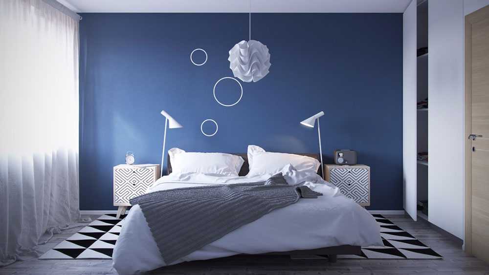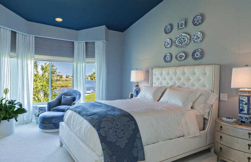 Сам по себе бело-синий интерьер считается необычным, глубоким и очень красивым. Не все решаются на подобное оформление своей спальни