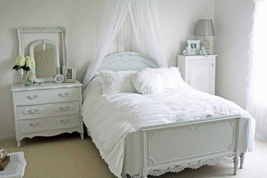 Кровать, тумбочки, шкаф для одежды и другую мебель чаще всего покупают в белом цвете, хотя отдельные элементы меблировки (кресло, пуф) могут быть другого цвета. Также хорошо вписывается в интерьер натуральное дерево, лоза.