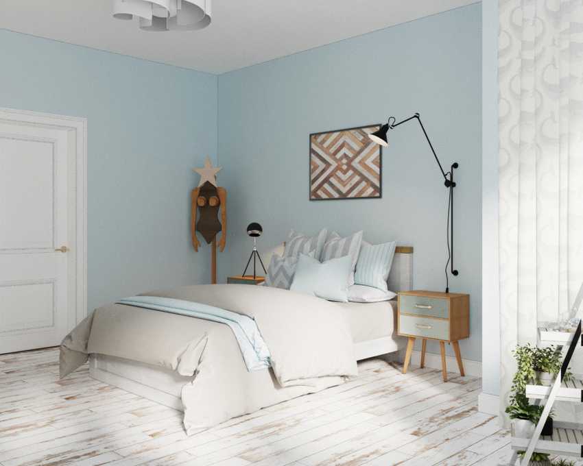 Эти цвета хорошо сочетаются со светлой мебелью, белыми аксессуарами, создают приятную зону для отдыха и сна.