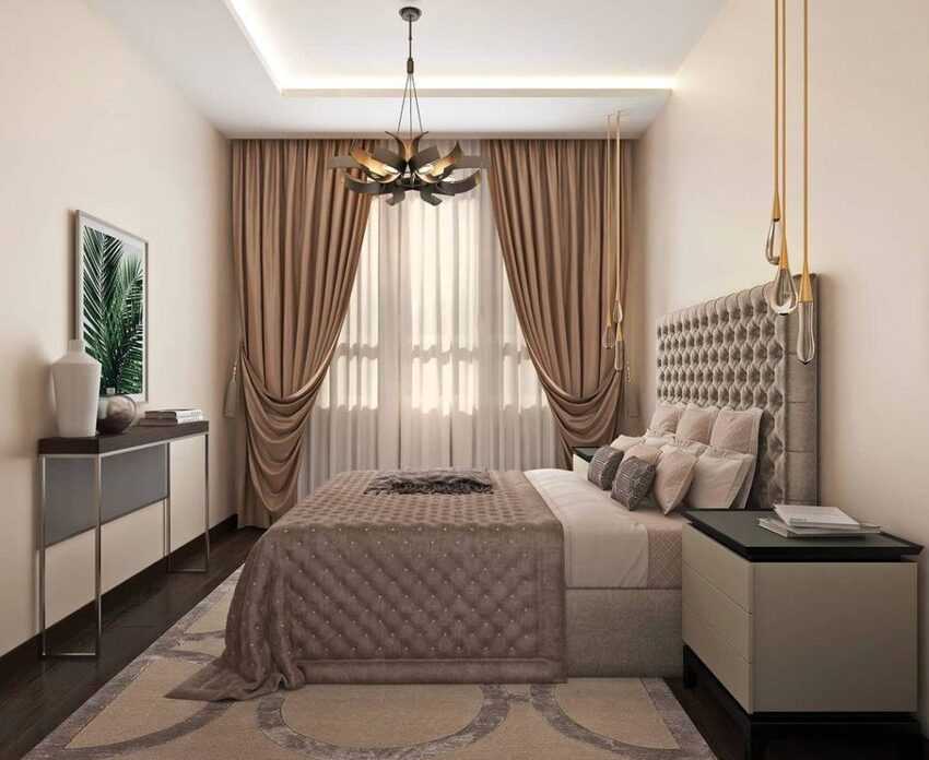 - интерьер светлой спальни дополняют длинные шторы, не обязательно аналогичной цветовой гаммы, что и стены; хорошо смотрятся римские шторы.
