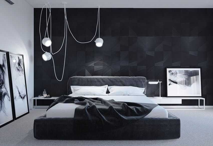 Черными могут быть прикроватные покрывало, постельное белье, шторы на окнах, даже оконные переплеты. Такой интерьер вряд ли можно назвать скучным и монотонным.