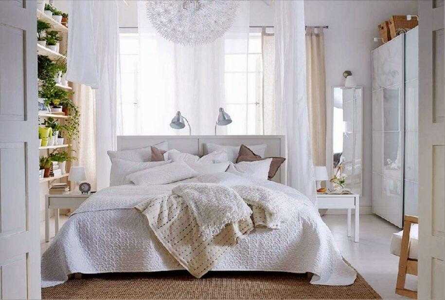 Для того, чтобы белая спальня стала уютной и комфортной, комнату декорируют текстилем из натурального хлопка, льна или шерсти. Придать интерьеру неповторимости и добавить в него ярких красок, можно при помощи контрастных подушек, пледов или покрывал.