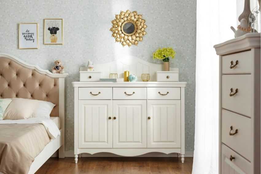 Но для оформления спальни в таком стиле придется подобрать мебель, соответствующую цвету стен, покрытую белым или бежевым лаком.