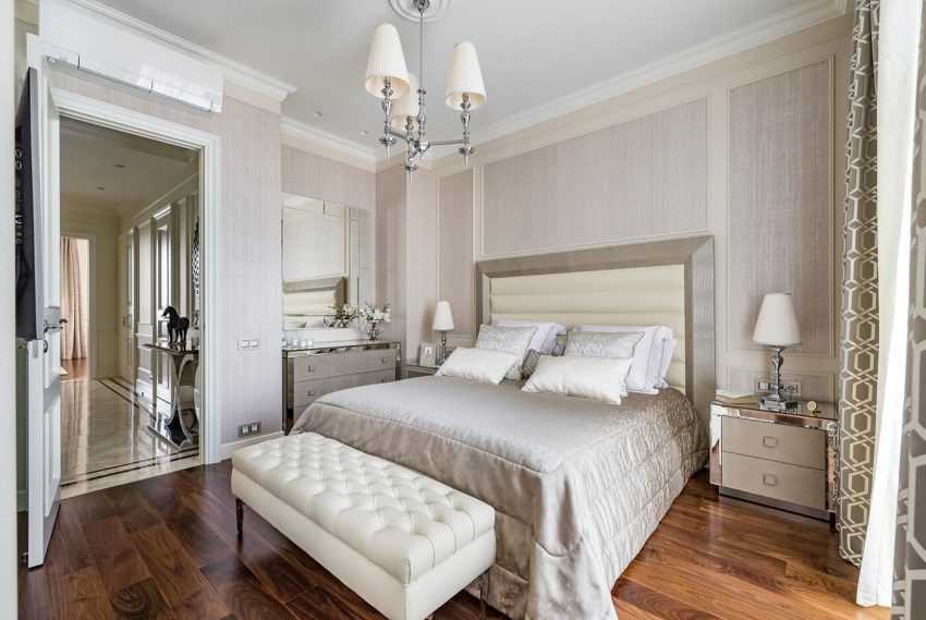 На фото пол, выложенный паркетом и однотонные окрашенные стены, декорированные гипсовой лепниной в интерьере спальни в классическом стиле.
