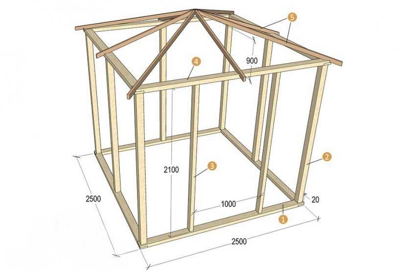 1 — нижняя обвязка, брус 100х50; 2 — вертикальная опора, брус 80х80; 3 — стойки входа 80х50; 4 — верхняя обвязка; 5 — стропила.