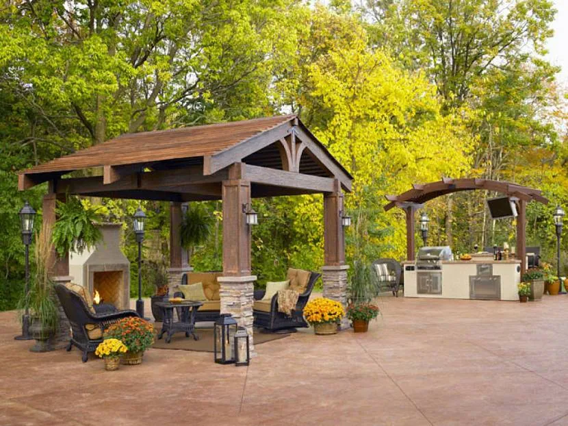 Важно, чтобы беседка с кухней сочеталась с окружающим ландшафтом и не сильно выбивалась на его фоне