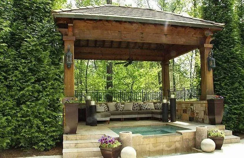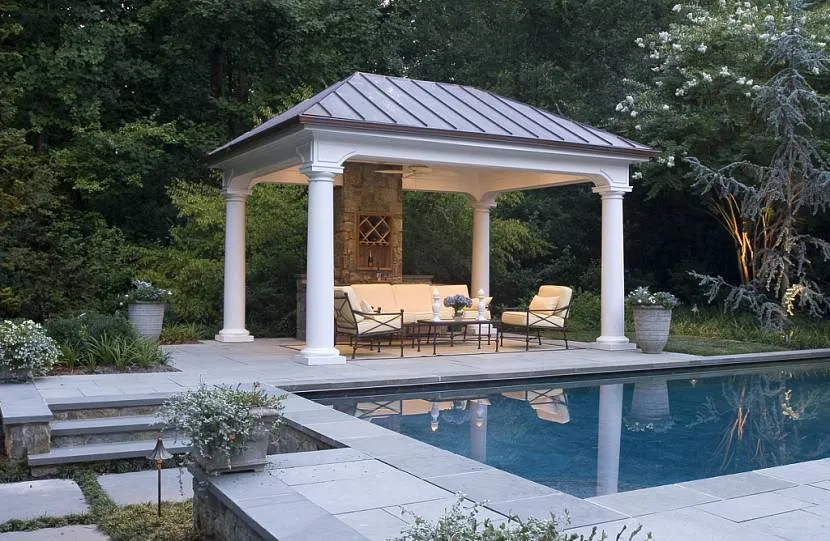 Отдых у воды традиционно считается одним из самых расслабляющих, поэтому красивую беседку нередко устанавливают рядом с бассейном или прудом.