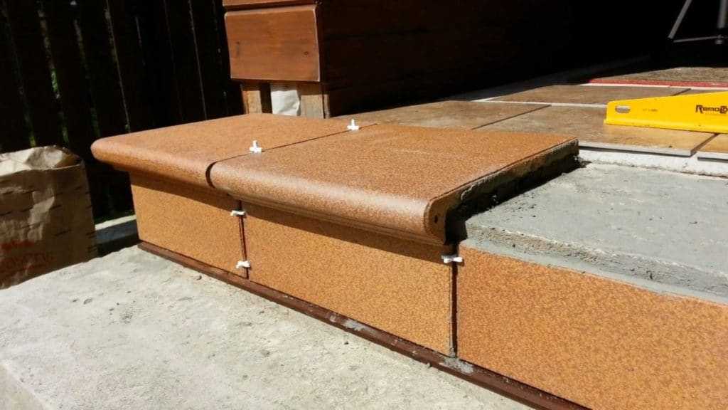 - Устанавливается верхняя плита с козырьком, который собой закрывает верхнюю часть подступени.