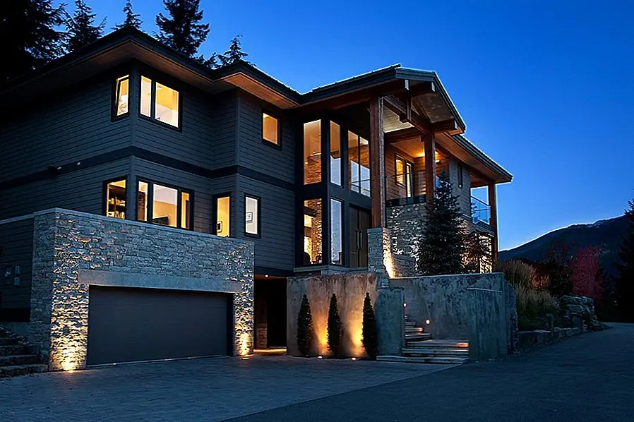 Чтобы легко интегрировать это стильное современное шале в его естественную среду, архитекторы использовали камень и дерево в качестве первичных материалов и поддерживали простой и органичный поток форм и пропорций по всему миру. Гараж — это кадры из каменных стен, а подсветка подчеркивает их текстуру ночью.