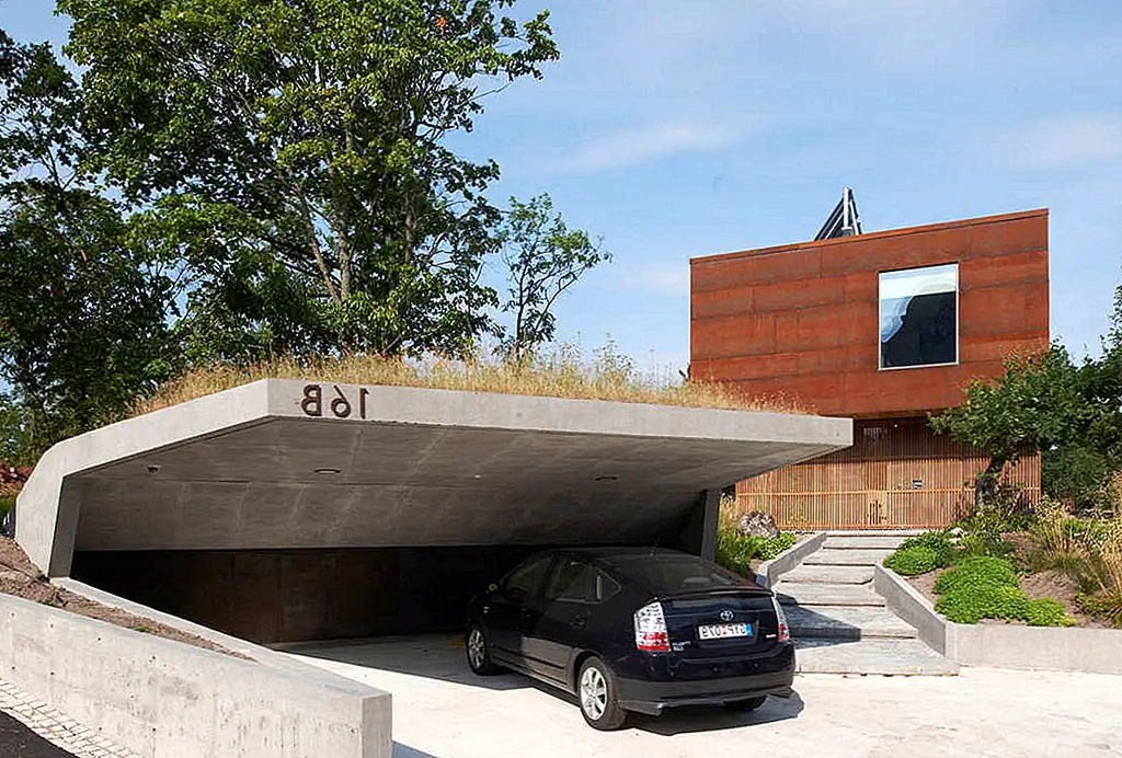 Открытый тип гаража, выбранный для этого дома, соответствует этой концепции дизайна, принятой для здания. Клиент хотел, чтобы у него был необслуживаемый фасад и общий открытый и расслабленный вид. В то же время они попросили DAPstockholm дать дому солидный и уединенный характер.