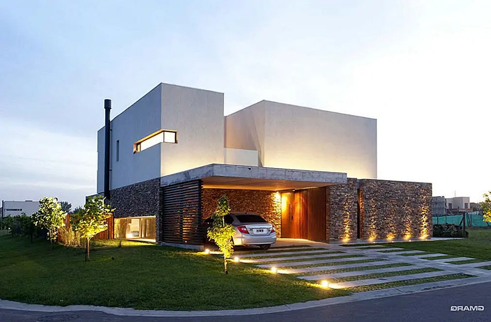 Концепция открытого гаража также была принята архитекторами Адрианом Говетто и Лукасом Мансильей, когда они спроектировали эту прохладную резиденцию в Буэнос-Айресе, Аргентина. Гараж обрамлен каменными стенами и служит буфером между улицей и жилыми помещениями, которые сгруппированы в задней части участка.