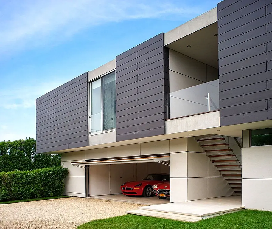 При проектировании этой резиденции в Бриджемптоне, Нью-Йорк, Stelle Lomont Rouhani Architects удалось найти способ сохранить внутренние помещения в частном секторе, а также обеспечить очень открытый и свежий вид повсюду. На первом этаже дома расположен гараж на две машины, который, несмотря на компактность, придает зданию очень тонкий вид.