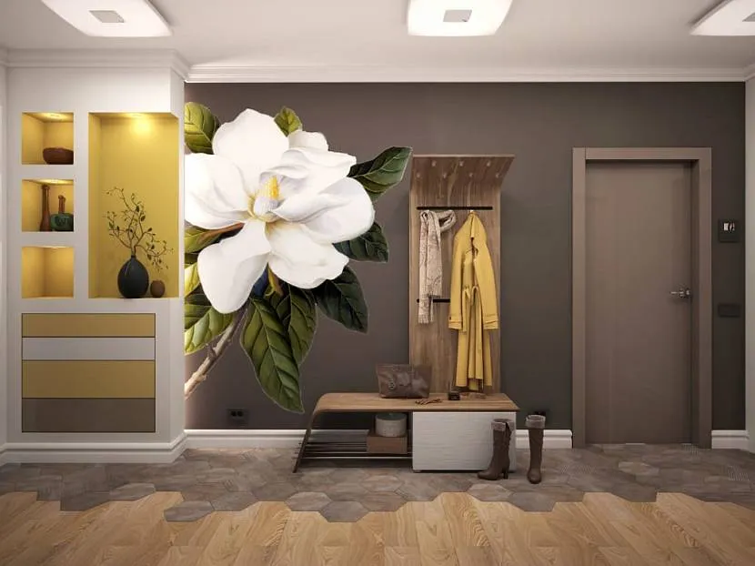 Актуальны растительные мотивы. Если помещение прихожей достаточно просторное, можно использовать модные обои для прихожей 2024 с крупными тропическими листьями и цветами. Правда увлекаться не стоит, так как чем крупнее рисунок на обоях, тем более тесным будет выглядеть помещение.