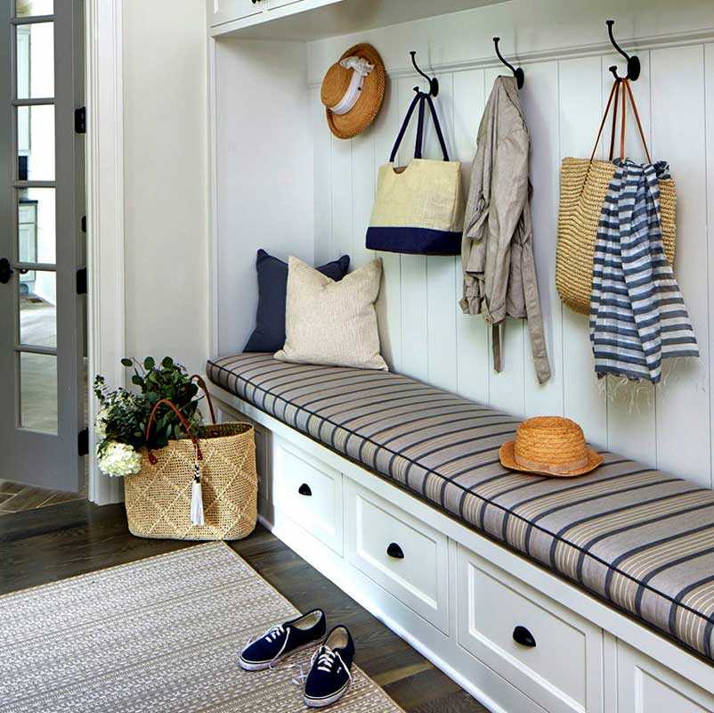 - Место, где можно присесть. В идеале вам нужно будет где-нибудь присесть в прихожей, чтобы надеть обувь или перевести дух после прогулки. Вместо скамейки можно поставить пуф, который будет также местом для хранения, например, тапочек. Нет ничего хуже, чем стоять возле гостей, просить их снять обувь и пальто, а затем наблюдать, как они пытаются удержать равновесие, когда переобуваются.