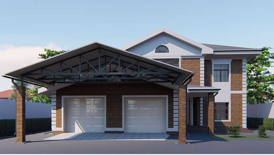 Двухэтажный гараж рассчитанный на размещение двух автомобилей оснащен отдельными въездами для каждого из авто.