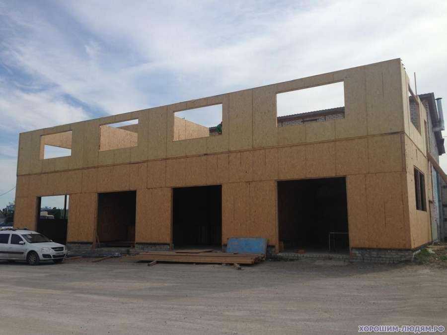 Небольшой двухэтажный гараж рассчитан на размещение одного автомобиля. Как можно заметить данные СИП панели обладают достаточной толщиной и не требуют наслаивания друг на друга для достижения определенной ширины.