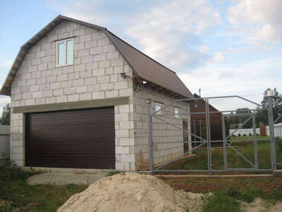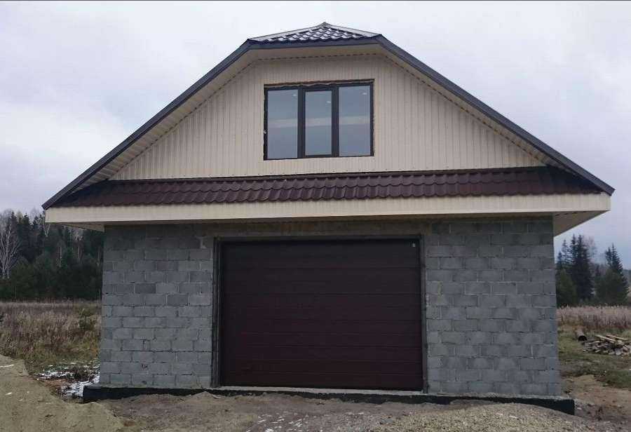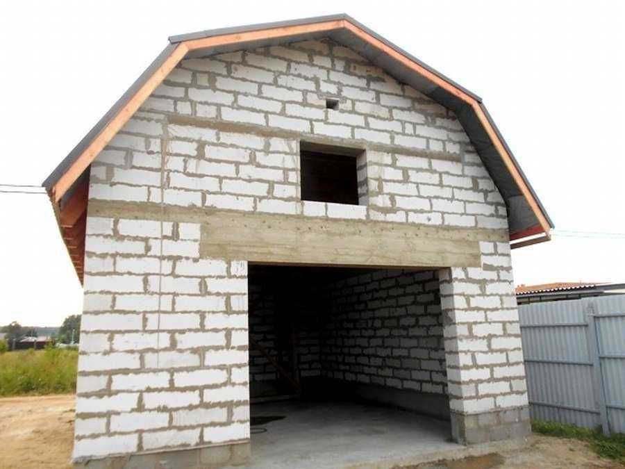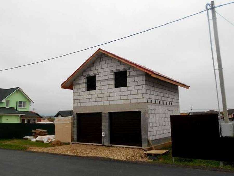 Двухэтажный гараж сооруженный из газоблока оснащен мансардной крышей с высокими потолками.