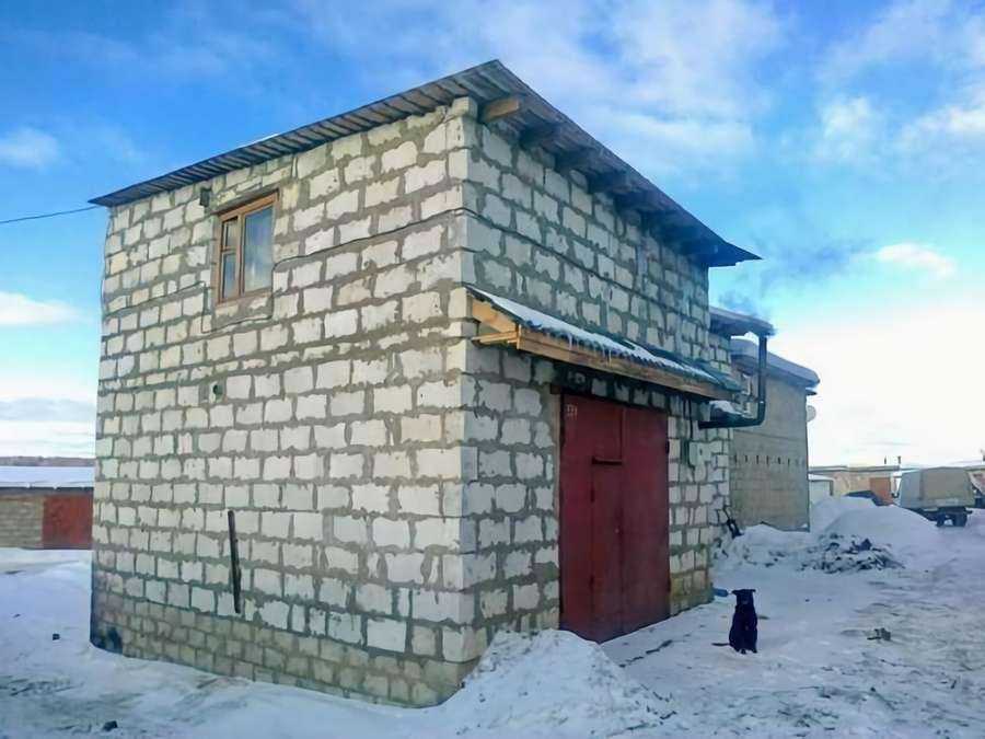 Удлиненный двухэтажный гараж выполнен из пеноблоков. Пеноблоки представляют собой смесь из песка, воды, цемента и специального пенообразователя. Сама конструкция гаража предусматривает наличие бокового окна в целях большего освещения.