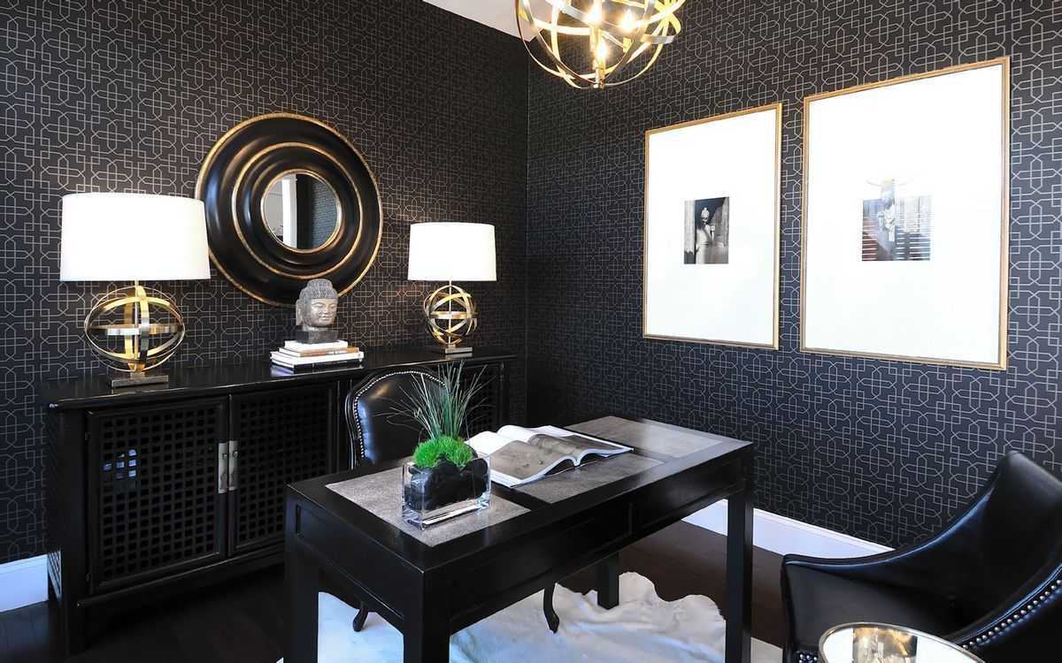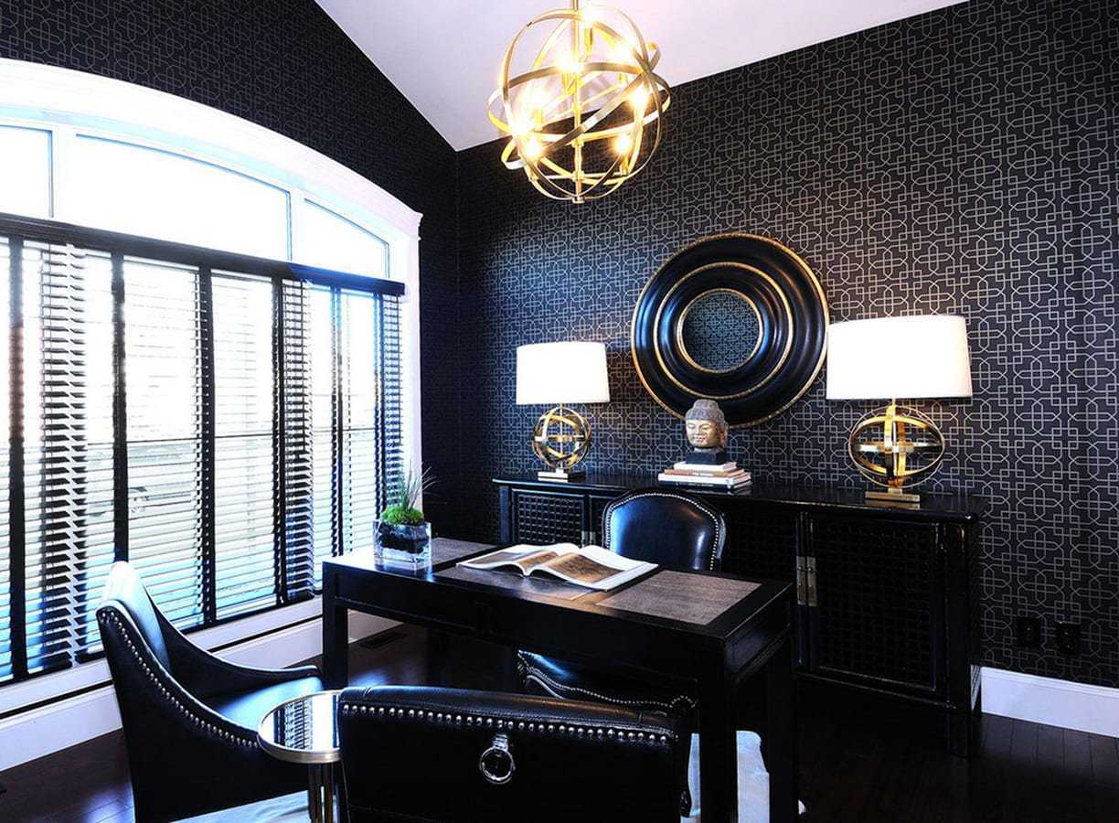 Чтобы чёрный кабинет не выглядел футуристично и слишком холодно, на помощь придёт дерево. Этот натуральный материал обладает приятным рисунком на срезе и представлен в богатой гамме. Мягкие золотистые, бежевые, красные, тёмно-коричневые и сероватые оттенки древесины отлично дополнят чёрную основу офиса.