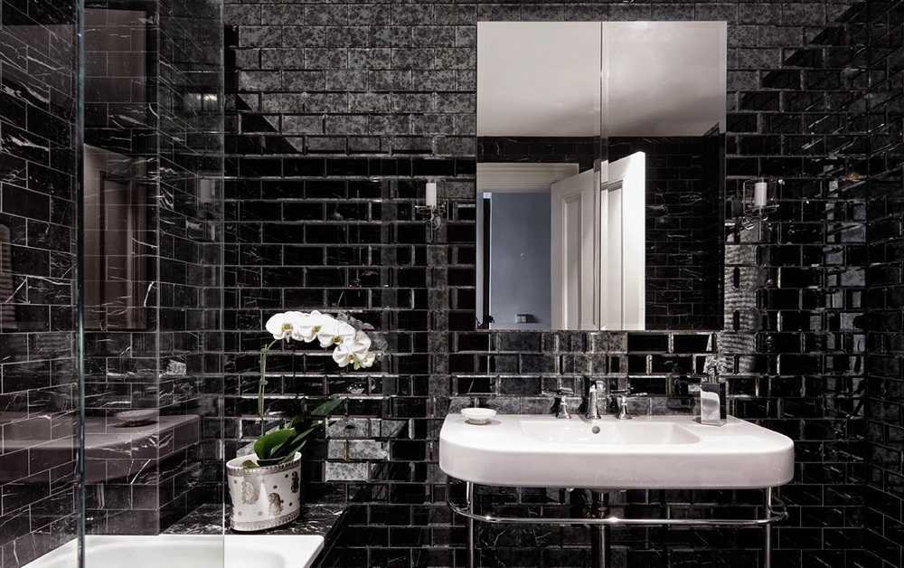 черная плитка с рисунком должна применяться не на всей стене, лучше расположить ее выборочно