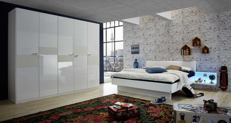 Собственно отделка под кирпичную кладку одной из стен уже является мощным идентификатором стиля. Если его дополнить большим шкафом-купе с зеркальными створками и правильно расположить, то визуально пространство станет еще больше. Оно также расширится, если использовать для отделки стен белую штукатурку.