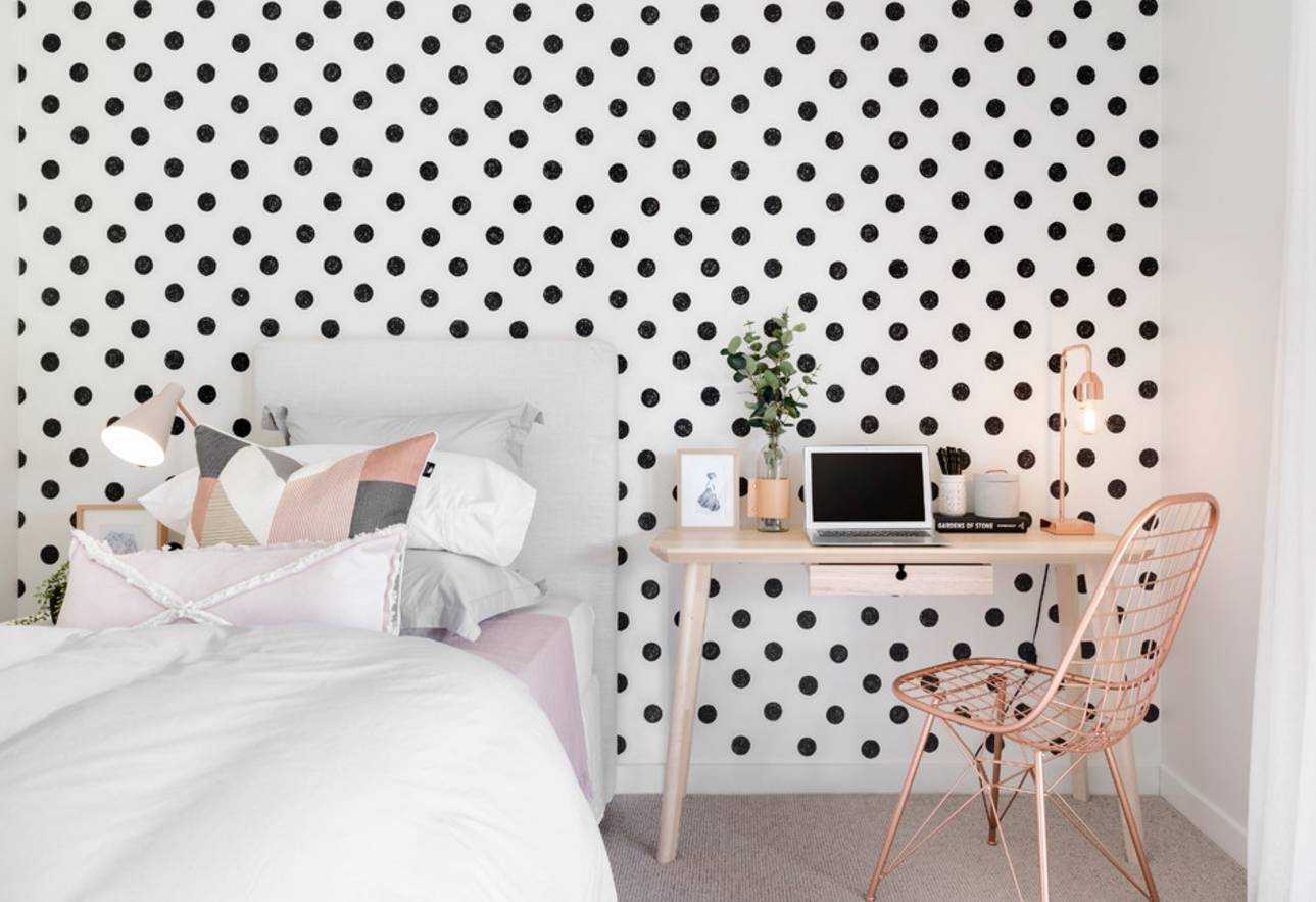 На фото подростковая детская с глянцевой мебелью, пышным пуфом и рулонными шторами. Горизонтальные полосы на стене делают маленькую комнату визуально шире.