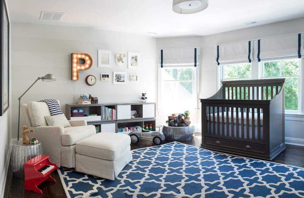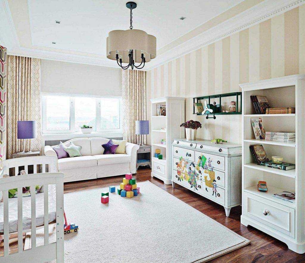На втором году жизни ребенка их легко можно разбавить яркими красками: в интерьер Средиземноморского стиля добавить синий или бардовый оттенок, в интерьер Прованса – лиловый, фиолетовый, пурпурный, а классику разбавить изумрудным, красным или синим цветом.