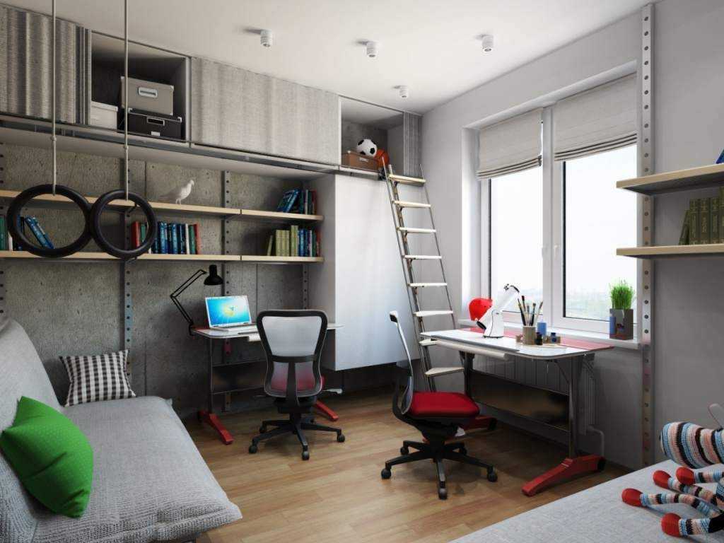Основная трудность заключается только в оптимизации пространства, так как необходимо разместить две кровати, две учебные зоны. Если в комнате будут жить дети с разными увлечениями, разного возраста или пола, то нужно позаботиться и о двух игровых зонах.