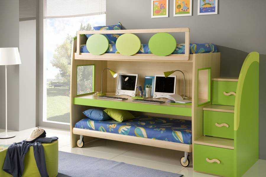 1. Кровати-чердаки или многоуровневые конструкции. Наверняка каждый мечтал в детстве о ней. Такое изделие может совмещать в себе и спальную, учебную, и игровую, и зону хранения вещей. В качестве декора можно установить подсветку, тогда чердак станет еще уютнее. Это идеальный вариант для совместной комнаты двух детей.