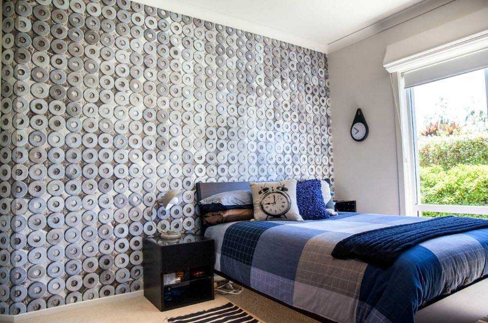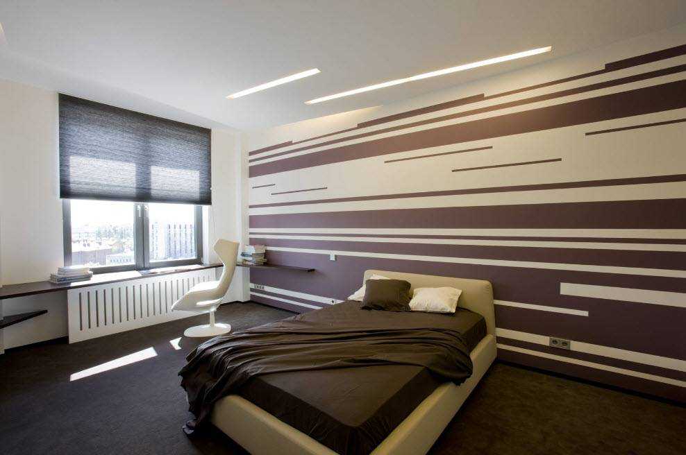 Для стиля хай-тек будет уместна еще одна идея: половина стены, оформленная полосами однотонных обоев 5-6 тонов, наклеенных елочкой.