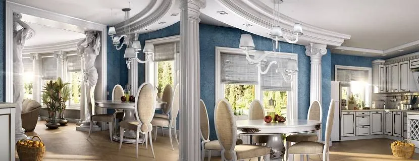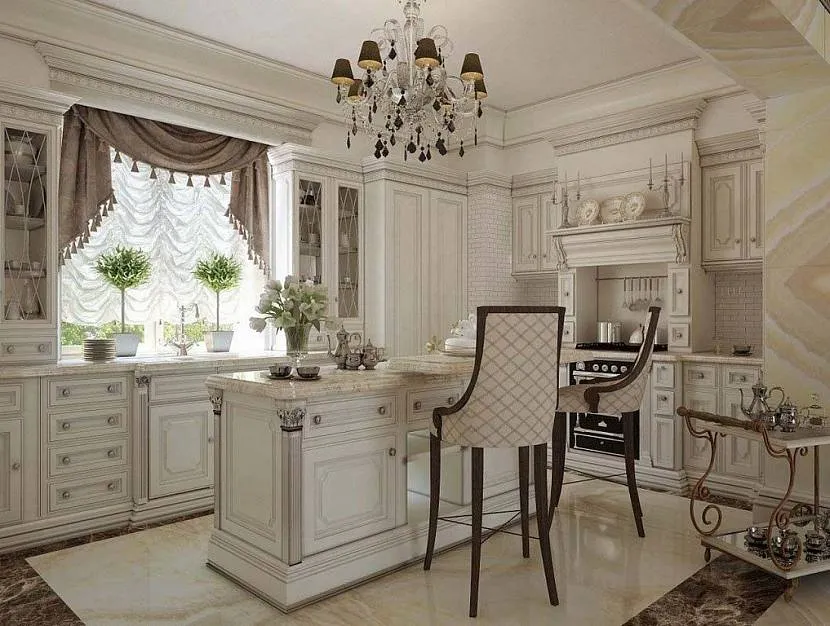 Такая кухня может похвастать необычными элементами в виде белых колонн, фресок на стенах. Белые фасады соседствуют с мраморной столешницей и мозаичным фартуком. Мебель имеет строгие формы, возможно присутствие резьбы. Разбавить яркий белый цвет призваны другие светлые оттенки, например, бежевые или серые стены.