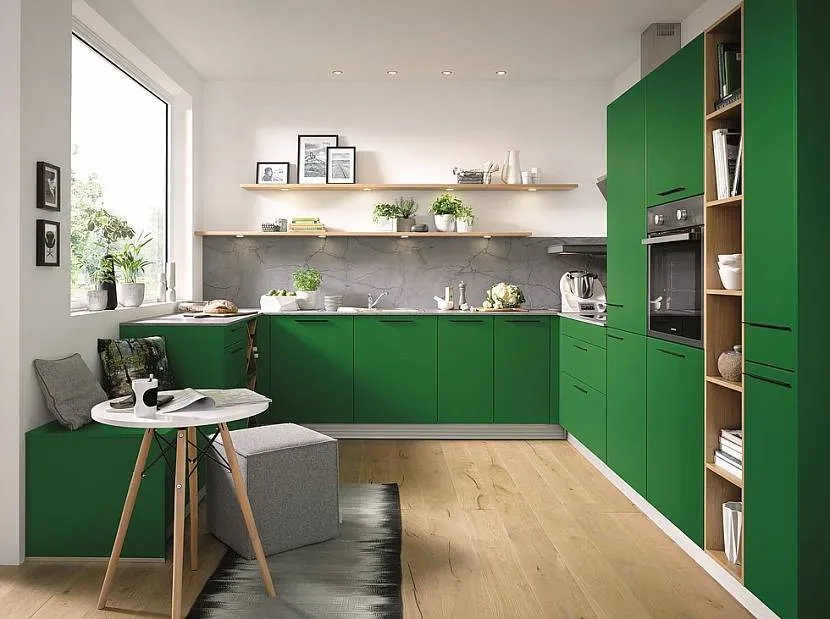 Зеленый. Креативный оттенок, он хорошо смотрится в любой тональности, как фон для кухни с белым гарнитуром. Фисташковый, мятный или оливковый — самые популярные цвета для покраски стен на кухне с белой мебелью и полом.