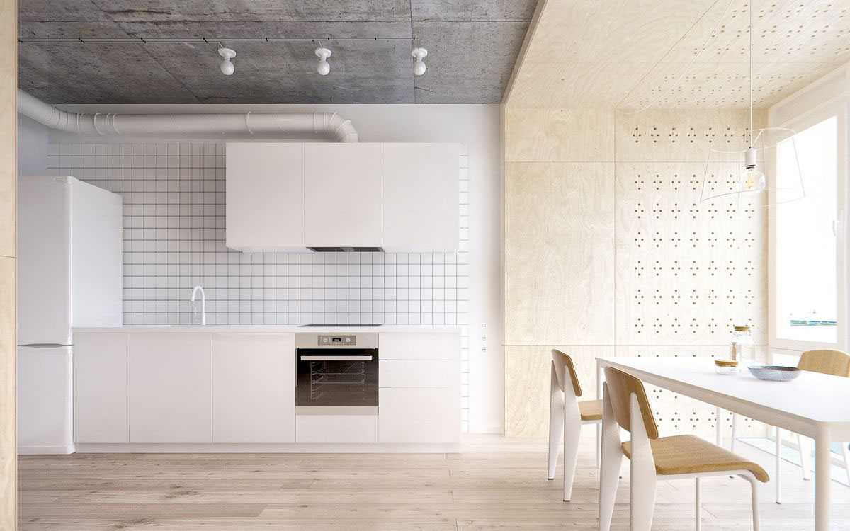 В дизайне белой кухни в качестве функциональных или декоративных составляющих традиционно используют элементы из дерева. Это естественное, простое и одновременно элегантное сочетание. Светлый монохром подчеркивает красоту дерева, а оно привносит теплые оттенки в интерьер. Белая кухня характерна для скандинавского стиля и минимализма.