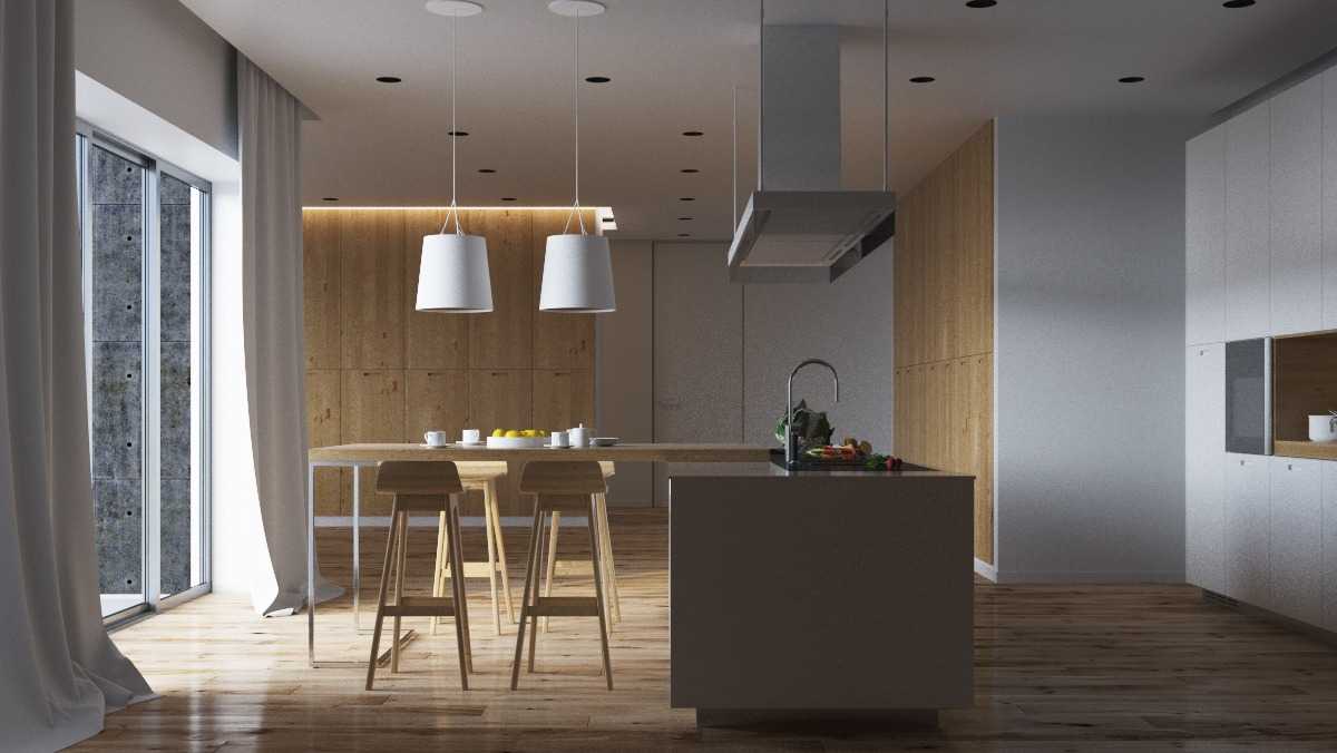 Каменный пол служит нейтральным фоном для белой с деревом кухни, дополненной металлическими акцентами.