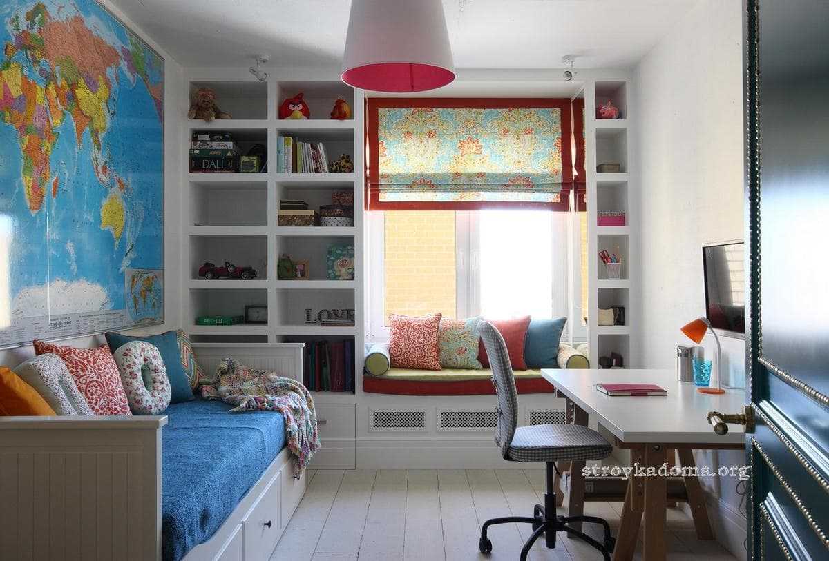 Если позволяет высота, можно убирать подоконник и вместо нее встраивать столешницу, увеличивая тем самым площадь рабочей поверхности. Расположение стола у окна освобождает больше места для игр и отдыха. Что очень актуально для маленьких комнат.