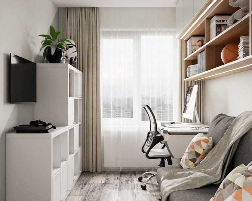 В отделке откажись от темных цветов: используй белый, молочный или светло-серый с цветными акцентами. Визуально увеличить пространство помогут вертикальные линии и мелкие узоры. Обязательно позаботься о том, чтобы в маленькой комнате всегда хватало света.