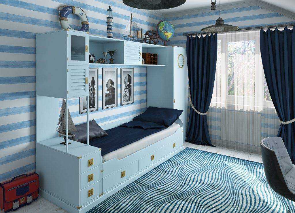 Начитавшись книг о приключениях пиратов, мальчишки начинают грезить путешествиями. Именно таким ребятам прекрасно подойдет морской стиль. Главными цветами тут выступают белый, золотистый и, конечно, все оттенки синего.
