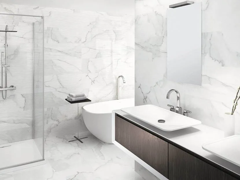 - Белый мрамор. Это самый роскошный и величественный оттенок. Может содержать примеси серого или бежевого цвета. Такой тон подойдет любому помещению, но особенно хорошо применять его в маленьких ванных комнатах.