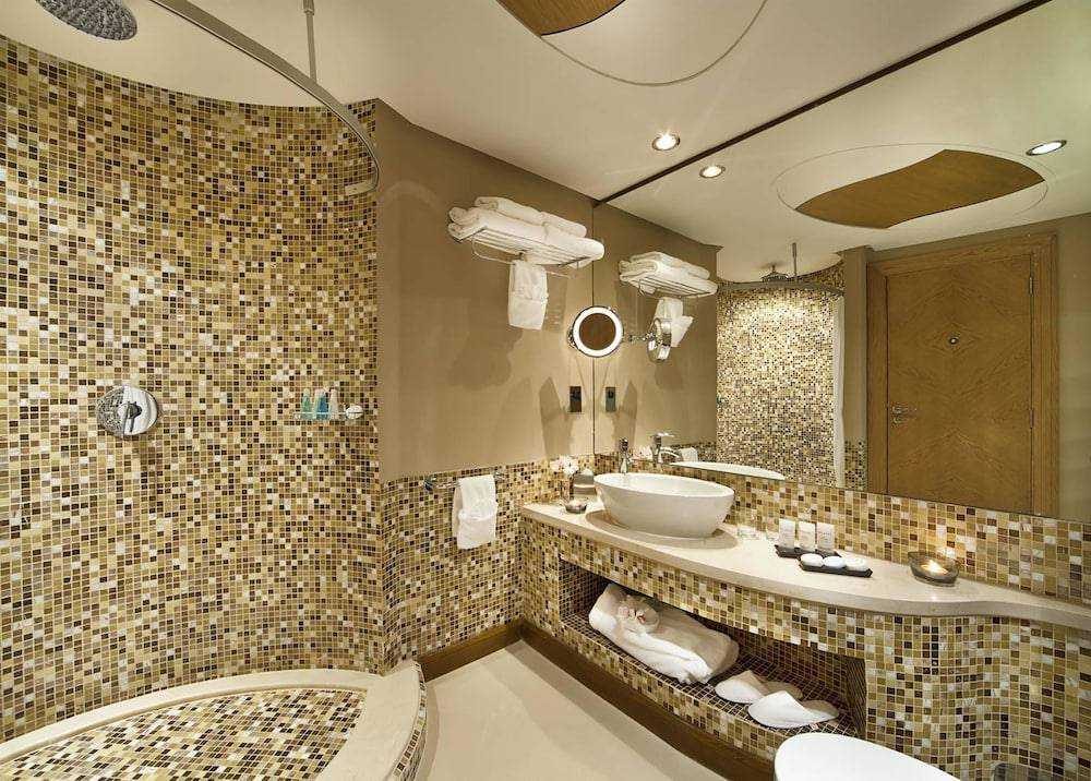 В создании восточной атмосферы поможет светлая бежевая мозаика. Останется лишь добавить в интерьер ароматические свечи, и получится домашний спа-салон. Мозаика золотисто-песчаного оттенка привнесет тепло и солнечный свет. Благодаря ей фактура ванной комнаты станет более интересной и глубокой.
